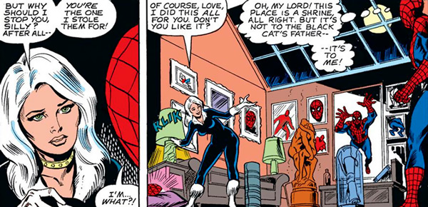 Black Cat ne trouve d’ailleurs que peu d’intérêt à Peter Parker, seul l’intéresse le héros masqué. C’est la raison essentielle qui amènera leur rupture. Son look comme son caractère sont too much et c’est bien ce qui fait tout le charme du personnage. Voleuse romantique au positionnement parfois ambigu, elle n’a peur de rien. Son costume de latex hyper sexy a fait prendre un coup de vieux à la Veuve noire et annonce une nouvelle génération de super héros sans complexe. Quand elle ne se bat pas avec lui, elle accompagne Spider-man dans ses combats les plus difficiles. Même si la relation entre eux n’est jamais durable, la Chatte noire n’a certainement pas fini de venir perturber la vie de l’Araignée, à suivre…