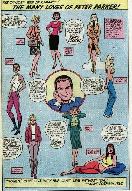Revenons un moment au Tisseur pour un top chronologique de ses amours. Ce qui est fascinant dans le personnage, c’est que depuis 1962, il fait l’objet d’une et parfois de plusieurs publications par semaine. Il a traversé ces dernières décennies au rythme de notre propre quotidien et sa vie privée s’est construite en fonction de l’évolution des modes et des pensées depuis les années 60.