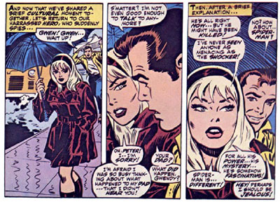 Gwen est un personnage plus subtil qui est un produit de la fin des années 60 et du début des années 70. Elle reste à jamais le grand amour de la vie de Parker avec qui elle forme un couple parfait. Affublée de son désormais légendaire serre tête, c’est une gravure de mode genre Vogue apparemment assez sage mais pas dénuée de caractère.